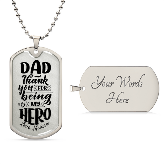 Dad Dog Tag Necklace from Daughter – Thank You for Being My Hero – Personalized Gift for Dad – optional Message on Back – Silver or Gold